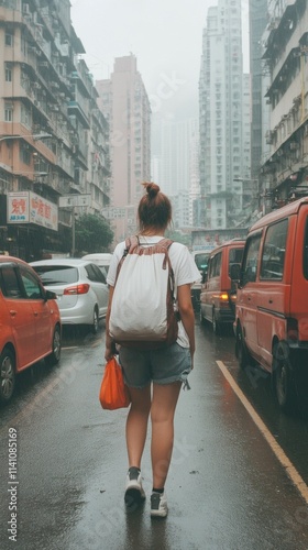 A woman walks through a busy city street on a rainy day, wearing a white oversized t-shirt and carrying a bag. The urban environment showcases cars and tall buildings, creating a vibrant atmosphere
