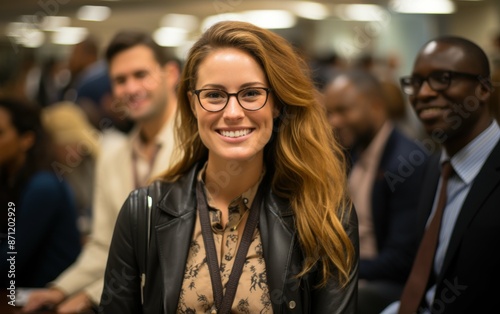 A woman wearing a black leather jacket and a lanyard smiles at the camera while attending a conference or symposium