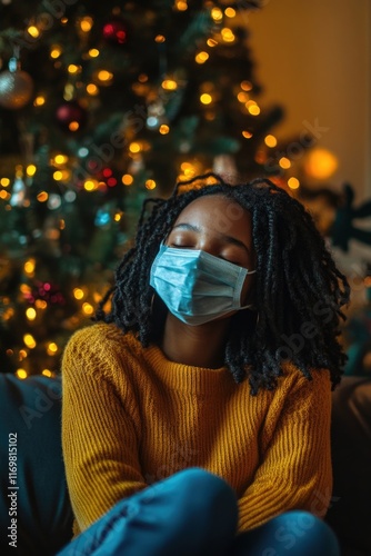 A woman wearing a face mask enjoys the festive ambiance of a Christmas tree. She is comfortably seated, exuding a cozy and celebratory vibe.
