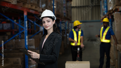 A woman wearing a hard hat and a suit stands in front of a warehouse with a clipboard in her hand