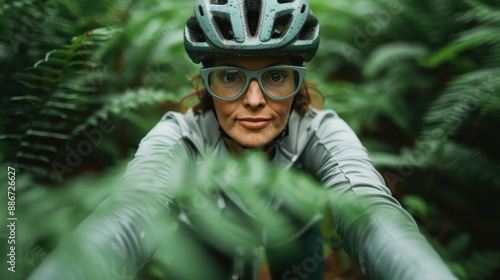 A woman wearing a helmet and glasses rides her bicycle through dense green foliage, capturing her determination and the beauty of outdoor forest adventure.