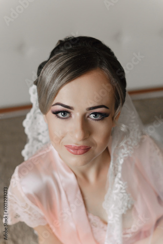 A woman wearing a pink robe and a white veil. She has a smile on her face. Concept of happiness and celebration