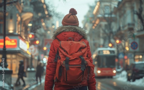 A woman wearing a red coat and a red backpack is walking down a city street. The street is busy with people and vehicles, including a bus and a car