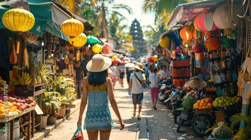 A woman wearing a straw hat walks down a street with a variety of fruit for sale