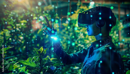A woman wearing a VR headset is picking lettuce in a greenhouse by AI generated image