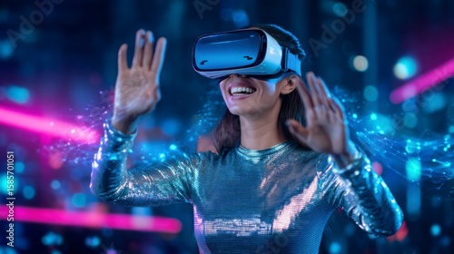 A woman wearing a VR headset smiles as she interacts with a virtual environment, surrounded by neon lights and futuristic digital effects.