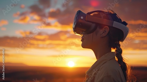 A woman wearing a white dress is playing a video game with a virtual sun in the background. The scene has a peaceful and relaxing mood
