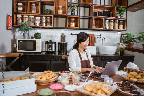 a woman wearing an apron on a laptop while sitting in the kitchen