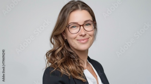 A woman wearing glasses and a black jacket is smiling