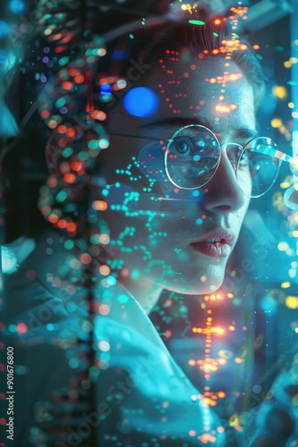 A woman wearing glasses is looking at a computer screen with a blue background. The image has a futuristic and technological vibe, with the woman's glasses and the computer screen being the main focus