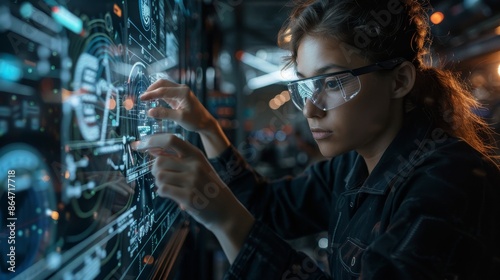 A woman wearing glasses is looking at a computer screen with a lot of numbers