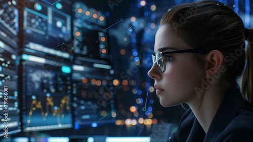 A woman wearing glasses is looking at a computer screen with multiple monitors