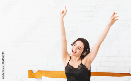 A woman wearing headphones is energetically raising her arms in the air. She appears to be enjoying music while expressing joy and excitement through her body language.