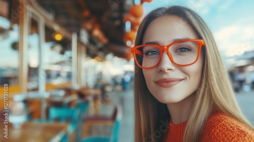A woman wearing red glasses is smiling at the camera. She is standing in front of a restaurant with chairs and tables