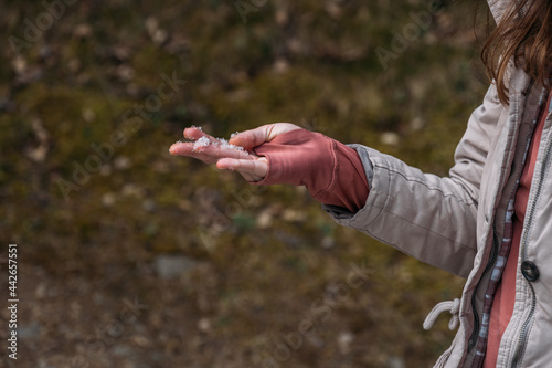 A woman wearing thumbhole jumper and holding melting snow in her hand during hiking in spring.