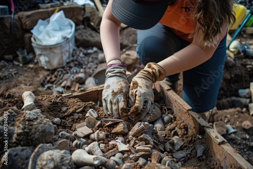 A woman wearing work attire is carefully digging in a large pile of rocks, possibly uncovering ancient artifacts or geological specimens