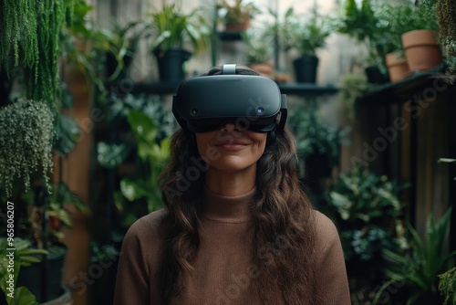 A woman wears a VR headset amidst a lush indoor garden, filled with various green plants, symbolizing exploration of virtual realms while surrounded by nature.