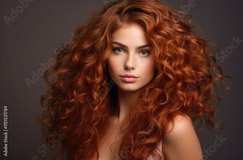 A woman who has long, beautiful, and flowing red curly hair is currently wearing a vibrant red shirt that complements her hairstyle perfectly