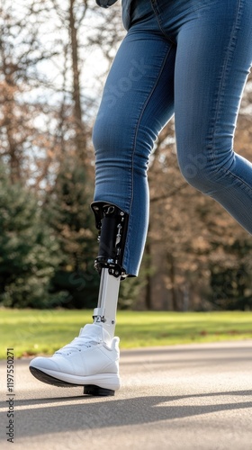 A woman with a black prosthetic leg walks along a tree-lined street covered in autumn leaves, showcasing resilience and mobility