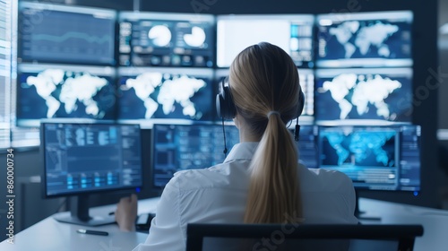 A woman with a headset monitors data on multiple screens in a control room, focusing on global information and analytics.