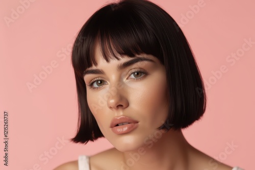 a woman with a short bob haircut and a pink background
