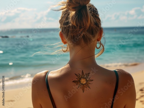 A woman with a sun tattoo on her back, simple and bold design