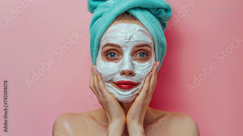 a woman with a turquoise towel wrapped around her hair applies a white facial mask, looking relaxed and content against a pink background.