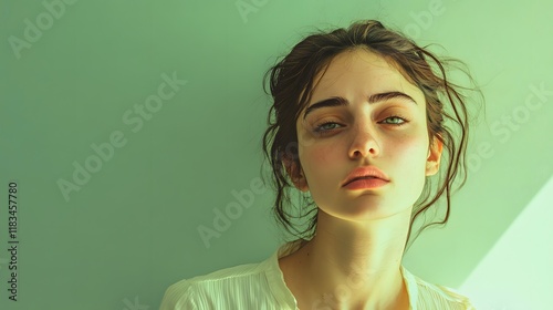 A woman with an expression of exhaustion, slouched shoulders, and tired eyes, against a pale green background