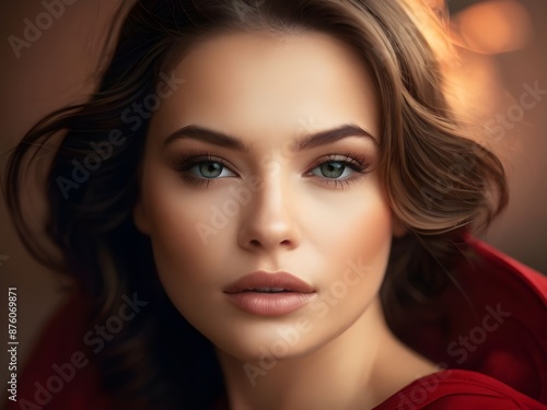 a woman with brown hair and a red shirt is posing for a photo