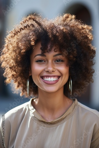 A woman with curly hair is smiling and wearing gold earrings