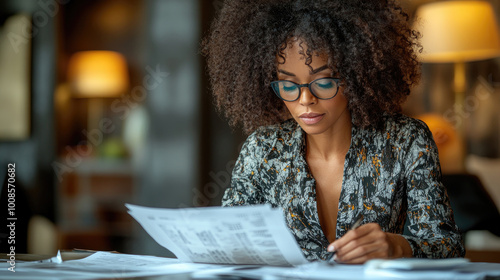 A woman with curly hair reviews documents intently at a cafe, surrounded by warm lighting and papers scattered on the table