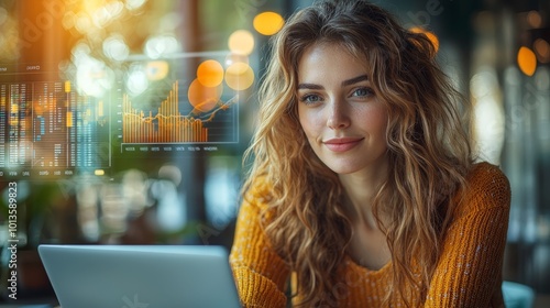 A woman with curly hair works on a laptop, surrounded by data visualizations in a cafe.