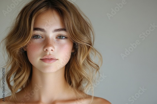 A woman with distinctive freckles on her hair and eyes, captured in a single image
