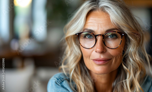 A woman with glasses and long hair is smiling. She is wearing a blue shirt. Concept of warmth and happiness