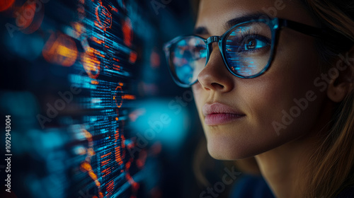 A woman with glasses focuses intently on a vibrant screen filled with digital data, immersed in her analysis late at night in a dark environment