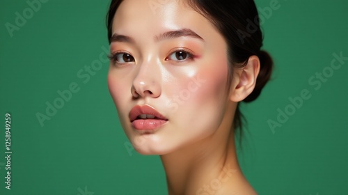 A woman with glowing skin, neatly styled hair, and a serene expression.