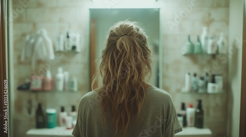 A woman with long, blonde hair tied in a ponytail stands pensively before a bathroom mirror, surrounded by various bottles, suggesting self-care and introspection.