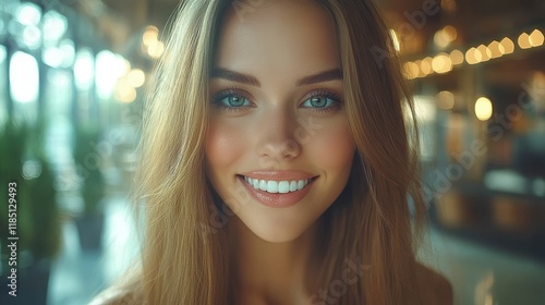 A woman with long brown hair and blue eyes is smiling. She has a bright, happy expression on her face