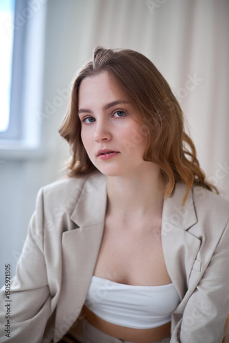 A woman with long brown hair is wearing a white blouse and a tan jacket. She is looking directly at the camera with a serious expression