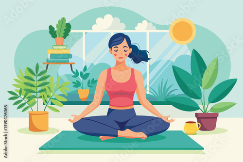 A woman with long, dark hair meditates on a green yoga mat in a bright room with large windows, plants, and a cup of coffee.