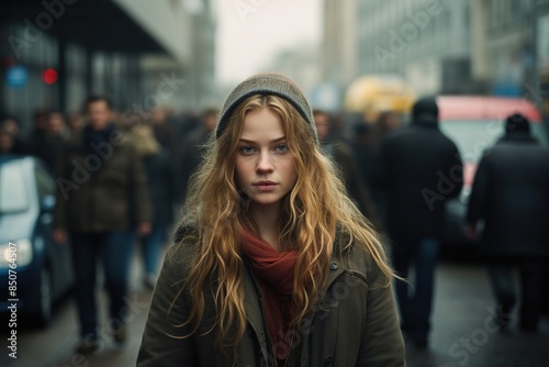A woman with long hair and a hat stands in a crowded street