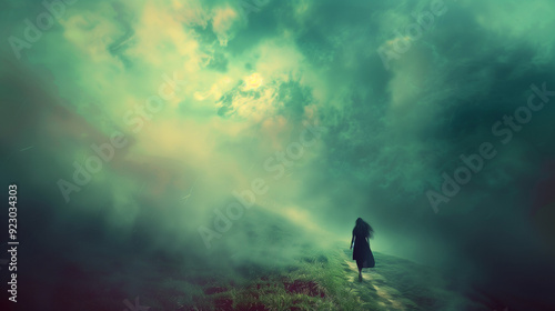 A woman with long hair walking along a path shrouded in dense emerald fog