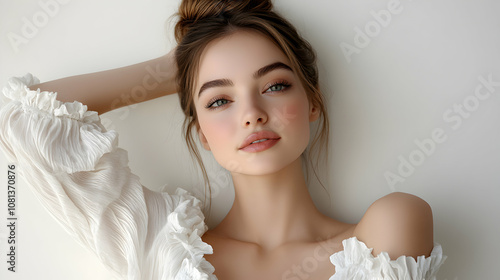 A Woman with Makeup Wearing a White Ruffled Blouse Poses Elegantly Against a White Background