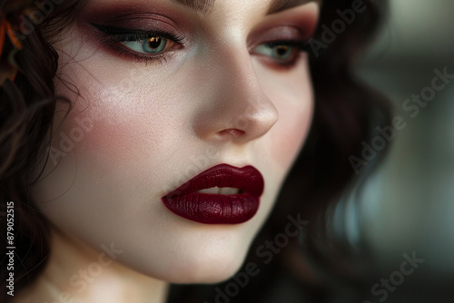 A woman with red lips and green eyes