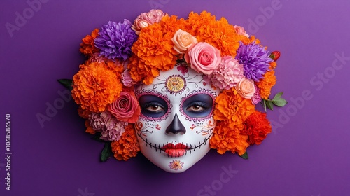 A woman with traditional Day of the Dead makeup, surrounded by colorful flowers on a purple background.