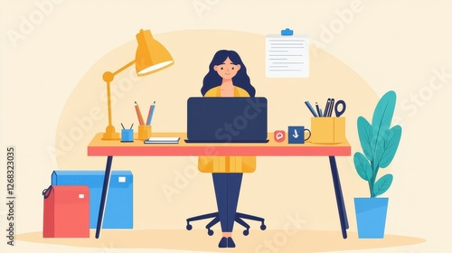 A woman working at a desk with a laptop and office supplies., social media content creator concept