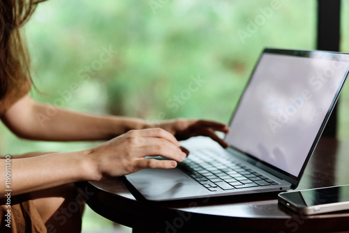 A woman working on a laptop, focusing on her professional tasks, surrounded by a serene green background, reflecting productivity and modern lifestyle