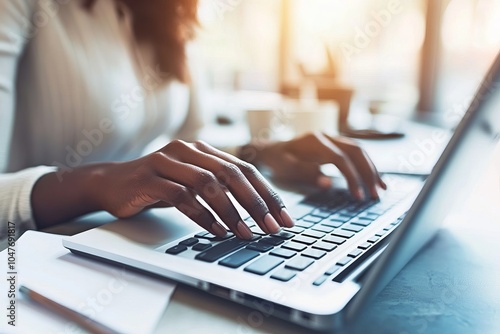 A woman works on a laptop at a modern desk, focused and productive in a well-lit, calm room