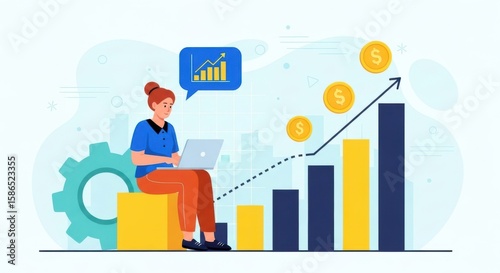 A woman works on a laptop near a gear and a bar chart showing financial growth and progress