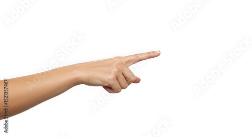 A woman's arm and hand pointing to the right on a transparent background isolated
